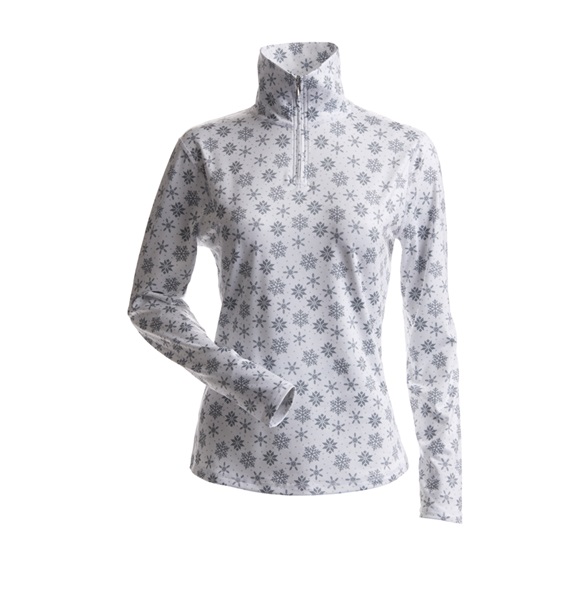 Long sleeve 1/4 zip t-neck in a custom snowflake print design with a soft interior finish. This top features natural wicking and anti-microbial properties.