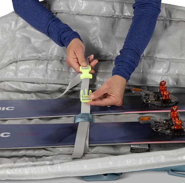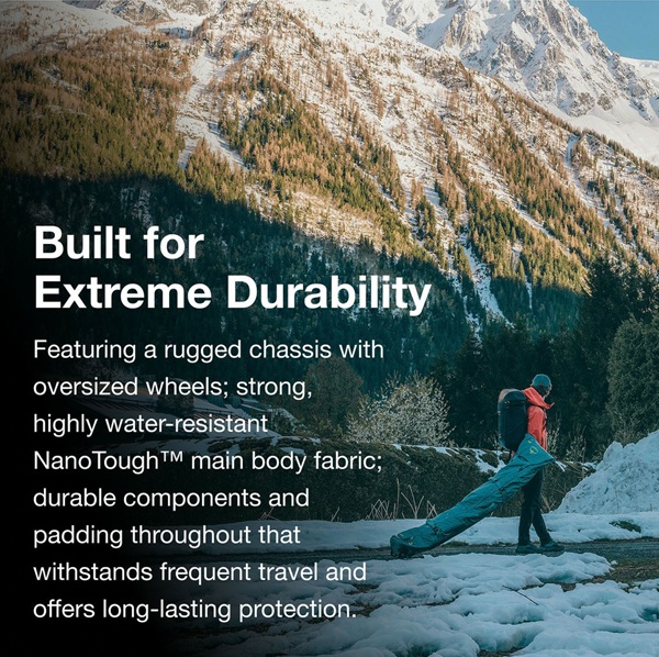 Elevate winter travel with unmatched reliability and ease. The Mountain Bound Roller’s rugged chassis and oversized wheels take variable terrain in stride, while durable, highly water-resistant NanoTough™ fabric, padded sidewalls and internal/external compression secure one or two snowboards or pairs of skis (up to 195 cm) on long travel days.